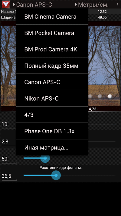 В меню можно выбрать наиболее распространенные виды сенсоров: Canon, Nikon, 4/3. Также можно ввести вручную ланные любой матрицы (пункт "Иная матрица..."). Будучи фанатом видеокамер Black Magic, я разместил их вверху списка. Надеюсь, это не проблема.